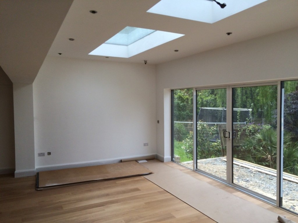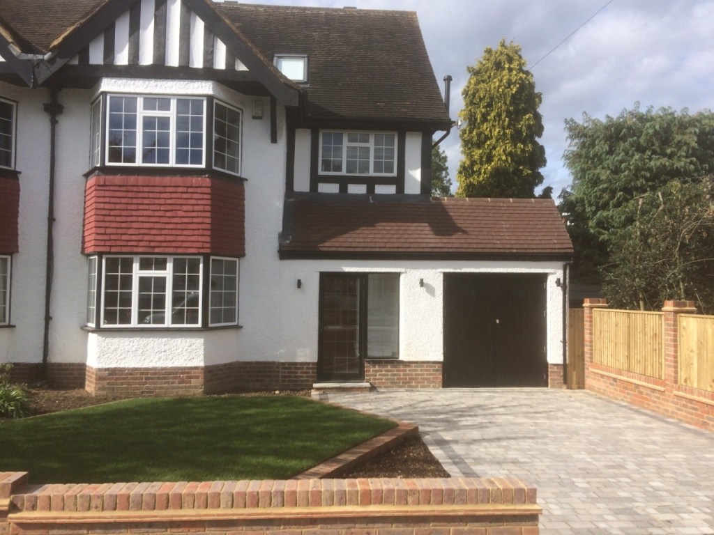 A side and rear extension to a semi-detached home in Petts Wood. Work included a new garage to the side and living space to the back, including installation of a new kitchen and patio area to the outside.